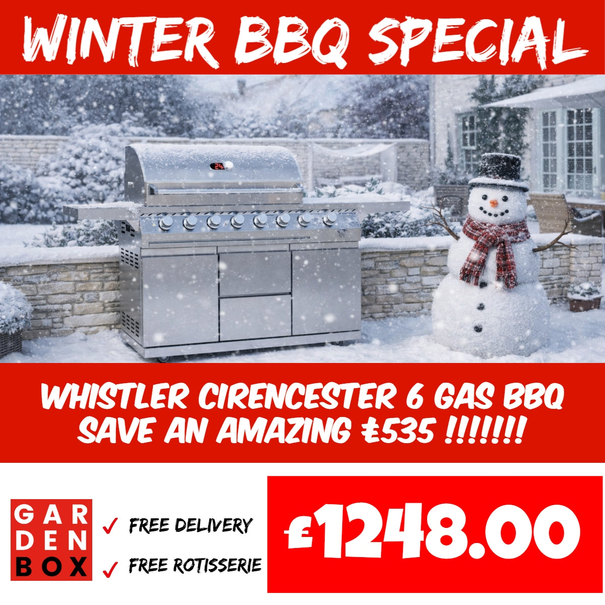 PRODUCTS . Gardenbox Winter Sale | Save up to 50% OFF . WINTER SALE: Whistler Cirencester 6 Gas Barbecue with side burner and rear rotisserie burner. 30% OFF! Now just £1248