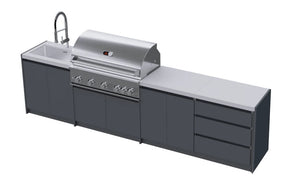 The Whistler Fairford Modular Outdoor Kitchen allows you to get the layout of your outdoor kitchen just how you want it with a choice of it being in a straight line, 90 degree angular ends and with a choice of either Stainless steel or Black gas grills. Proving an enormous kitchen setup with tons of prep space and storage you will be the envy of your friends with this setup in your garden as it includes everything you need right out of the box including triple drawer pack, double door cupboard, sink, fridge, worktops, large grill, and storage and it is so easy to build. With the option of a side burner too. There is loads of storage space, a double outdoor fridge to keep the drinks cool and a sink to wash up afterwards, all finished in a choice of two colours, light grey and carbon grey. The grill gives you loads of cooking space, that will cater for up to 15 people with ease, plus there is a free rotisserie pack. Getting your outdoor kitchen up and running could not be easier with all the units pre-built and on adjustable castors. Simply move in to position and bolt together and away you go.